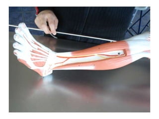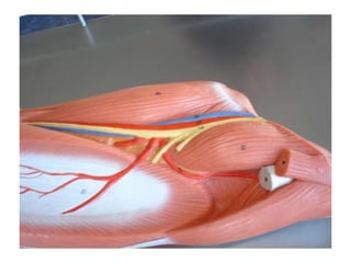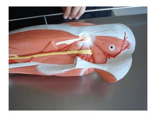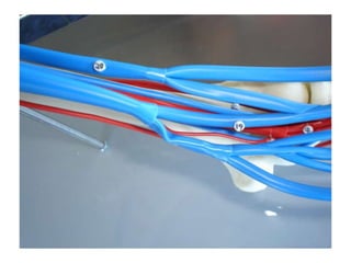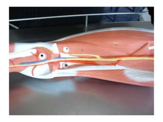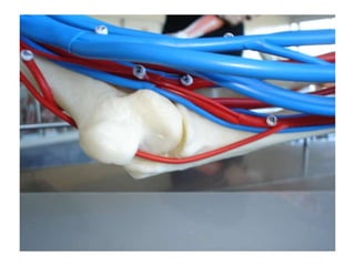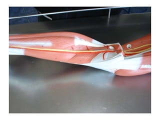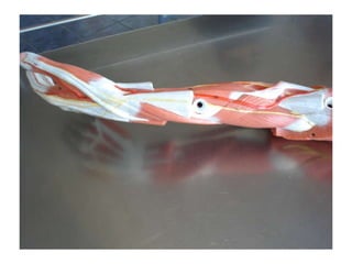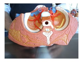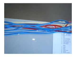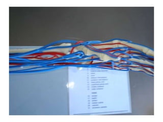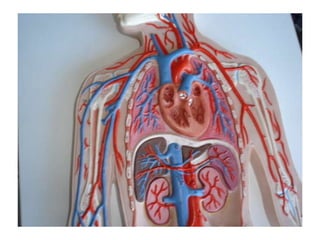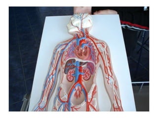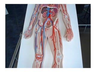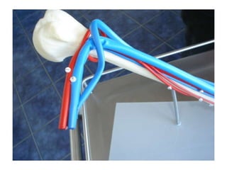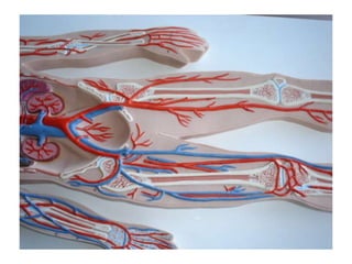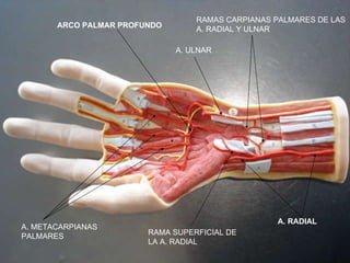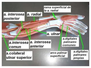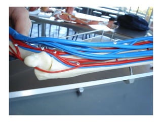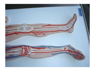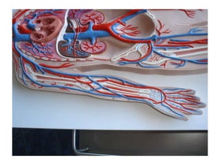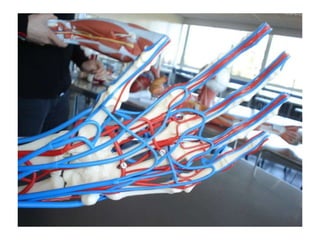 El documento describe la anatomía vascular de las extremidades superiores e inferiores, así como el corazón y los pulmones. Detalla las principales arterias y venas, incluyendo las arterias y venas palmares, las venas de la mano, las arterias coronarias, las venas cavas y las venas y arterias pulmonares.