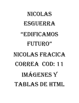 El documento describe cómo escribir códigos HTML básicos y de imágenes en un blog de notas para crear una página web con tablas. Explica brevemente los códigos necesarios para imágenes y tablas y cómo quedaría la página web después de escribir estos códigos.
