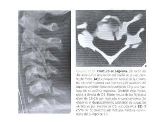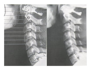 Este documento presenta información sobre la imagenología de la columna cervical. Explica cómo leer e interpretar radiografías cervicales, identificando estructuras anatómicas, procesos degenerativos, lesiones y estenosis. También cubre la tomografía computarizada y resonancia magnética, indicando los cortes y estructuras que muestran. El objetivo es que los kinesiólogos comprendan la importancia de estas imágenes para el diagnóstico y tratamiento de disfunciones cervicales.