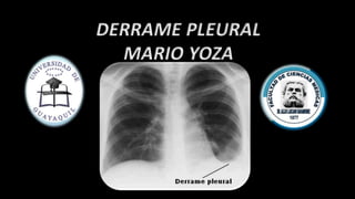 1) El documento habla sobre el derrame pleural, definido como la acumulación anormal de líquido en el espacio pleural. 2) Describe los síntomas clínicos como dolor torácico, tos y disnea, y los hallazgos en la exploración física como disminución de la expansión respiratoria y matidez en la percusión. 3) Explica las posibles causas como insuficiencia cardíaca, cirrosis, infecciones y neoplasias; y cómo se ve el derrame pleural en una radiografía de tórax