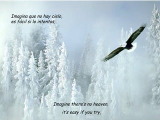 El documento presenta la letra de la canción "Imagine" de John Lennon. Propone imaginar un mundo sin fronteras políticas ni religiosas donde la gente viva en paz, armonía y comparta los recursos sin avaricia. Aunque algunos puedan ver esto como un sueño, Lennon cree que es posible si la gente se une para vivir como hermanos en un mundo unido.