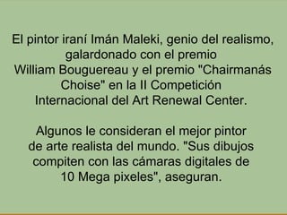 Este documento presenta al pintor iraní Imán Maleki, ganador de premios como el William Bouguereau y el "Chairman's Choice". Nació en 1976 en Teherán y estudió con el mejor pintor hiperrealista de Irán. Sus pinturas muestran la grandeza del pueblo iraní y la crudeza de la realidad que viven, siendo considerado por algunos como el mejor pintor de arte realista del mundo.