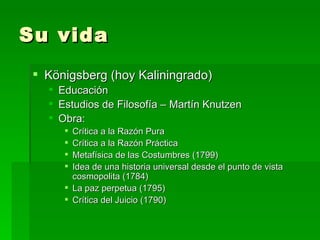 El documento resume la vida y obra del filósofo alemán Immanuel Kant. Nació en Königsberg en 1724 y estudió filosofía. Sus obras más importantes incluyen la Crítica de la Razón Pura, la Crítica de la Razón Práctica y la Metafísica de las Costumbres. Kant distinguió entre dos formas de conocimiento: la sensibilidad basada en la experiencia y el entendimiento basado en la razón. También distinguió entre juicios analíticos y sintéticos. En ética,