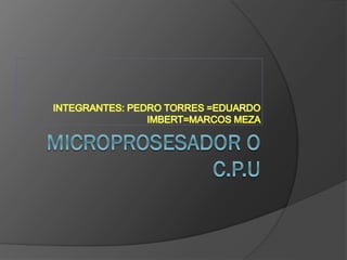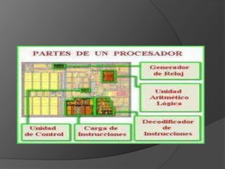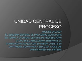 Este documento proporciona una introducción a la unidad central de procesamiento (CPU). Explica que aunque otros componentes como la tarjeta de video ahora manejan parte de la carga de trabajo, la CPU sigue siendo uno de los elementos más importantes para el rendimiento del equipo. Describe físicamente la CPU como un pequeño cuadrado de silicio con pines en un lado y una placa metálica de disipación de calor en el otro. El documento también indica que analizará las piezas más importantes de la CPU.