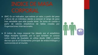 El documento aborda el Índice de Masa Corporal (IMC) como una herramienta para evaluar el estado nutricional basado en peso y altura, clasificado en diversas categorías de salud. También se explica la importancia del pulso como indicador de la intensidad del esfuerzo físico y la aplicación de la fórmula de Karvonen para calcular la frecuencia cardíaca adecuada en el entrenamiento. Se concluye que el conocimiento de estas mediciones es fundamental para mejorar la calidad de vida y seguridad en la actividad física.