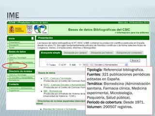 El IME es una base de datos bibliográfica que contiene más de 290,000 registros sobre biomedicina extraídos de 321 publicaciones periódicas españolas desde 1971, cubriendo temas como administración sanitaria, farmacia clínica, medicina experimental, microbiología, psiquiatría y salud pública.