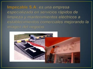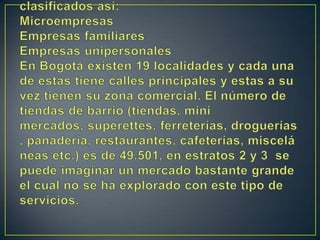 El documento describe un proyecto de empresa que ofrece servicios de identificación para negocios. El proyecto comenzará ofreciendo el servicio en las localidades del sur de Bogotá debido a los recursos limitados, enfocándose en una localidad a la vez. El proyecto busca generar ingresos a través de la comercialización de un servicio de identificación para negocios en zonas comerciales que necesitan renovar sus avisos debido al desgaste.