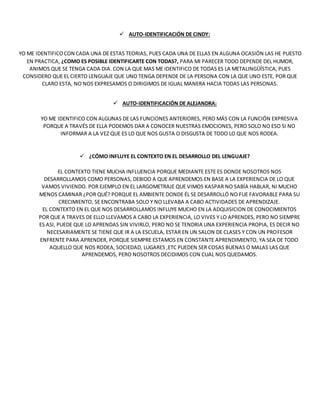 El documento describe las diferentes funciones del lenguaje, incluyendo la funcional referencial para informar, la funcional expresiva para expresar emociones, la funcional incitativa para hacer actuar, la funcional fática para establecer contacto, la funcional metalingüística que se apoya en el código lingüístico, y la funcional poética donde importa más la forma que el contenido.