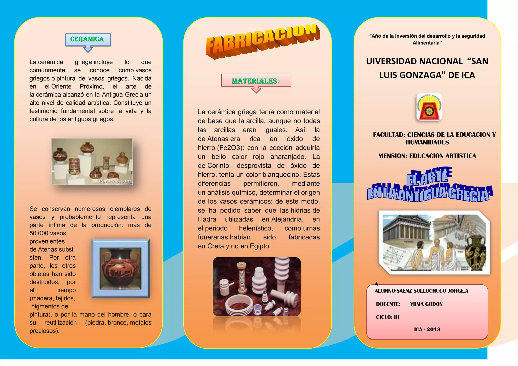La cerámica griega alcanzó un alto nivel artístico y constituye un testimonio fundamental sobre la vida y cultura griegas. Se conservan más de 50.000 vasos cerámicos de Atenas que representan una pequeña parte de la producción total. La cerámica griega se hacía principalmente de arcilla, aunque la composición variaba según la región, lo que permite identificar el origen de los vasos a través de un análisis químico.