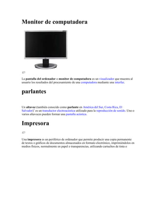 El documento describe los principales componentes de hardware de una computadora como el monitor, los parlantes, la impresora y la memoria USB, así como los diferentes formatos de archivos como .doc, .pdf, .jpg y .mp3 que se pueden usar para almacenar textos, presentaciones, imágenes, audio y video. También incluye una tabla con una lista de extensiones de archivo comúnmente usadas y una breve descripción de cada una.