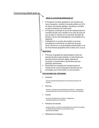 El Programa Conectar Igualdad busca reducir las brechas digitales, educativas y sociales en Argentina mediante la distribución gratuita de netbooks a estudiantes y docentes de escuelas públicas, con el objetivo de promover la igualdad de oportunidades educativas y el desarrollo de competencias digitales entre los jóvenes y sus familias. El programa contempla el uso de las netbooks tanto en la escuela como en el hogar para impactar la vida diaria de comunidades heterogéneas en todo el país.