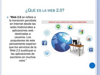 Este documento introduce la Web 2.0, definida como aplicaciones web destinadas a usuarios que promueven la inteligencia colectiva. Explica brevemente la historia de la Web y algunas de sus aplicaciones más conocidas como Facebook, YouTube, Twitter, Wikipedia y QZone.