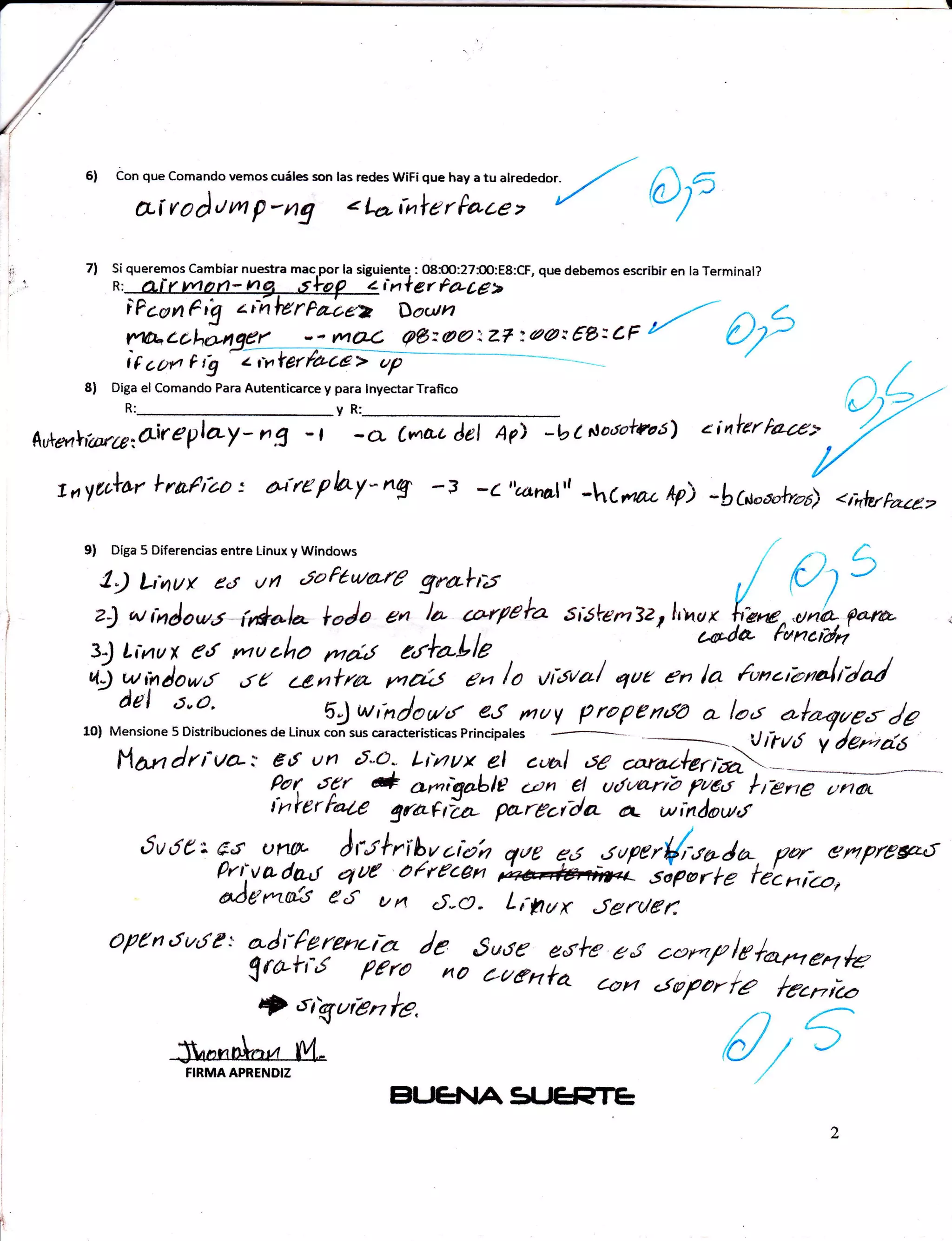 Este documento contiene preguntas y respuestas sobre comandos de Linux y sus características. Explica cómo escanear redes WiFi cercanas, autenticarse e inyectar tráfico de red. También compara las diferencias entre Linux y Windows e identifica cinco distribuciones de Linux principales con sus características como interfaz gráfica, soporte técnico y facilidad de uso.