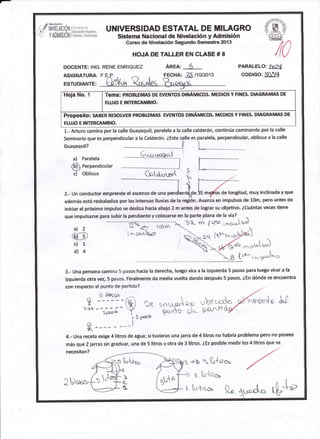 La hoja de taller trata sobre problemas de elementos dinámicos, medios y fines, y diagramas de flujo e intercambio. Contiene cuatro problemas para que los estudiantes los resuelvan. El primero pregunta si una calle es paralela, perpendicular u oblicua a otra. El segundo involucra a un conductor que debe subir una pendiente resbaladiza impulsándose. El tercero trata sobre los pasos de una persona. Y el cuarto involucra medir un volumen de agua usando jarras de diferentes tamaños.