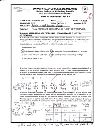 El documento es una hoja de taller de la asignatura de Estudiantes de la Universidad Estatal de Milagro. Contiene 3 problemas sobre diagramas de flujo e intercambio que los estudiantes deben resolver. El primer problema trata sobre 5 amigas que buscarán trabajo en 5 ciudades diferentes cumpliendo ciertas condiciones sobre su lugar de residencia. El segundo problema involucra el conteo de pasajeros que suben y bajan en diferentes paradas de un bus. El tercer problema trata sobre el intercambio de cromos entre 3 personas y el conteo
