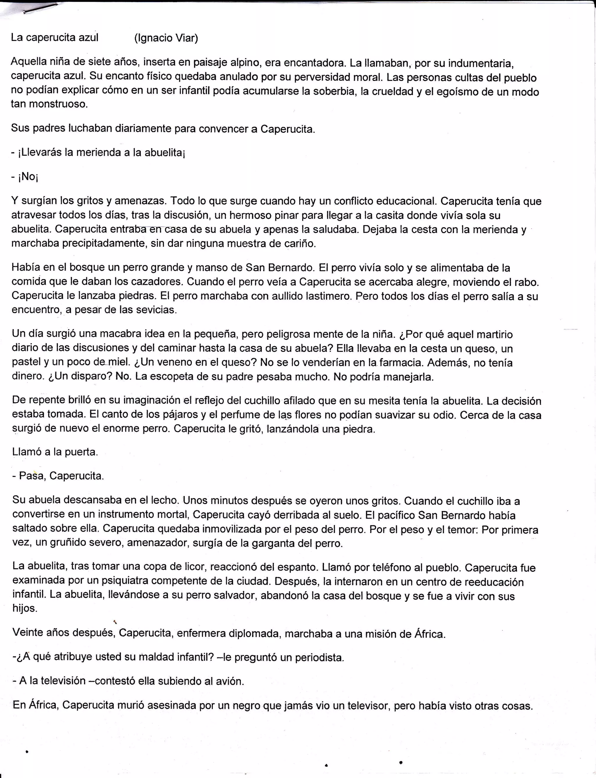 Este documento cuenta la historia de Caperucita Azul, una niña de 7 años conocida por su perversidad moral y crueldad. A pesar de los esfuerzos de sus padres, Caperucita se niega a llevarle la merienda a su abuela y trata mal a un perro manso. Un día, Caperucita tiene la idea macabra de matar a su abuela con un cuchillo, pero el perro la detiene. Caperucita es examinada por un psiquiatra y enviada a un centro de reeducación. Años después,