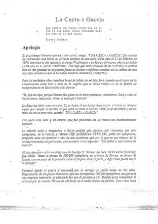 El documento describe cómo el autor escribió el ensayo "Una carta a García" en una hora de inspiración. El ensayo se publicó en una revista y generó una gran demanda de copias, lo que llevó a que una compañía ferroviaria pidiera 100,000 copias para distribuir a sus pasajeros, ayudando a popularizar la idea de cumplir con la misión encomendada sin importar las dificultades.