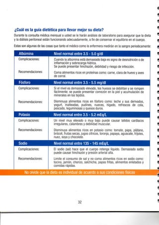 El documento proporciona guías dietéticas para pacientes con diálisis peritoneal, incluyendo niveles normales y recomendaciones para albúmina, fósforo, potasio y sodio. Los análisis de laboratorio mensuales monitorean estos valores para asegurar que la dieta y diálisis funcionan adecuadamente.
