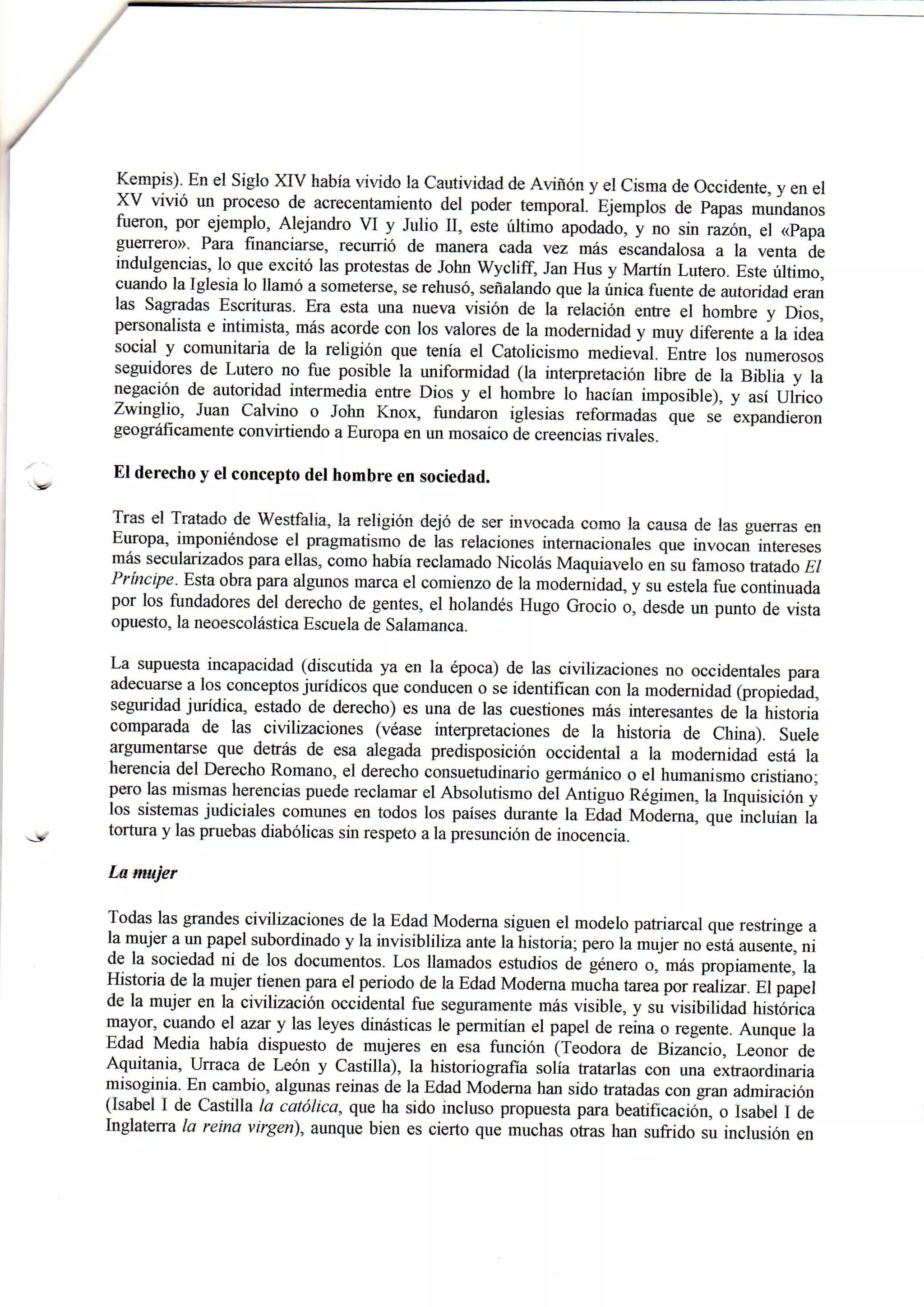 El documento describe algunos de los principales eventos y cambios que ocurrieron en Europa durante la Edad Moderna, incluyendo la Reforma Protestante, el Tratado de Westfalia que puso fin a las guerras religiosas, y el surgimiento de conceptos como el estado de derecho y la propiedad privada. También discute brevemente el papel de la mujer y las civilizaciones no occidentales durante este período.