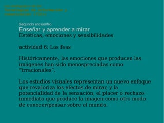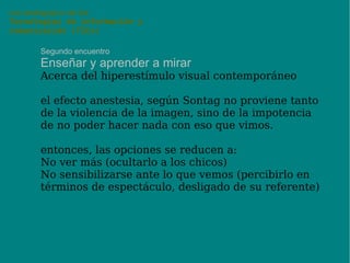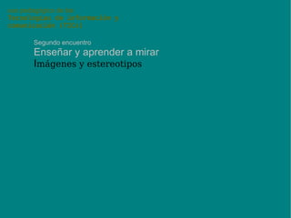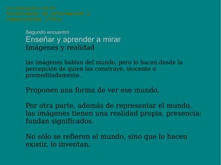 El documento aborda el uso pedagógico de las tecnologías de información y comunicación (TICs) en actividades no presenciales, centrándose en la enseñanza y aprendizaje a través de imágenes y su relación con la realidad. Se discute la polisemia de las imágenes, su poder como vehículos de transmisión de ideas y emociones, así como su impacto en la educación contemporánea. Se proponen encuentros y actividades prácticas para explorar la relación entre ver, saber y la interpretación de las imágenes en la educación.