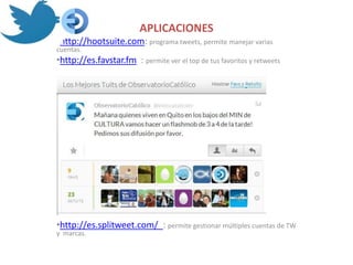 Este documento ofrece recomendaciones para la evangelización en redes sociales de manera efectiva. Algunas de las recomendaciones clave son: 1) centrarse en el testimonio de vida cristiana auténtica más que en los contenidos; 2) construir una comunidad acogedora en lugar de proyectos personales aislados; 3) mantener una actitud humilde y abierta al diálogo con todos. El objetivo final es dar frutos del Reino más que buscar el éxito personal.