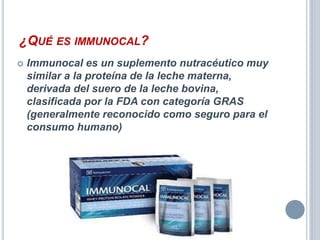 Immunocal es un suplemento nutricional derivado de la proteína de suero de leche bovina que funciona como desintoxicante y puede causar síntomas temporales como dolor de cabeza, fatiga o erupciones cutáneas durante el proceso. Contiene 9 gramos de proteína por porción y aunque es derivado de la leche, tiene menos del 1% de lactosa. Pacientes con trasplantes u otros tratamientos inmunosupresores no deben tomarlo sin consultar a un médico.