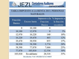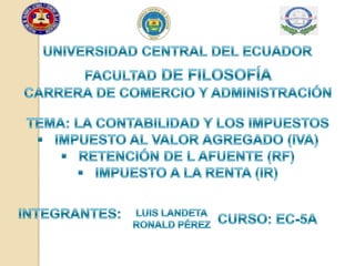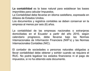 El documento describe varios aspectos relacionados con la contabilidad y declaración de impuestos en Ecuador. Explica que la contabilidad debe llevarse en español y dólares estadounidenses, y los registros deben conservarse al menos 6 años. Además, las empresas deben declarar periódicamente los impuestos causados, retenidos o percibidos usando formularios del SRI. Finalmente, detalla algunos detalles sobre el IVA como qué productos y servicios grava.
