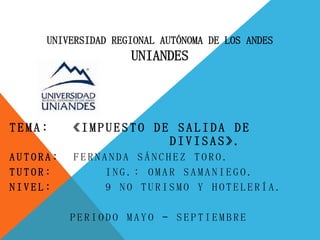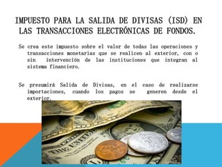 Este documento describe el impuesto de salida de divisas aplicado a las transacciones electrónicas de fondos que se realizan al exterior en Ecuador. La tarifa del impuesto es del 5% y no se aplica a montos menores a USD 1,000 dólares transferidos en un período quincenal. El impuesto no se cobra para ciertas importaciones como equipaje de viajero, donaciones humanitarias, y bienes diplomáticos.