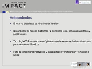 El proyecto IMPACT está financiado por la Comunidad Europea bajo el programa FP7 ICT. El proyecto tiene como objetivo mejorar significativamente la digitalización masiva de textos impresos históricos en Europa a través de la innovación en software OCR y tecnologías lingüísticas, compartir conocimientos entre instituciones europeas, y establecer herramientas y servicios sostenibles a largo plazo. La Biblioteca Nacional de los Países Bajos coordina el proyecto.