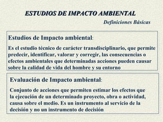 El documento proporciona una introducción a los estudios de impacto ambiental, definiendo conceptos clave como evaluación de impacto ambiental. Explica las etapas de un estudio de impacto ambiental e identifica diferentes tipos de evaluaciones. También describe varias categorías para clasificar los impactos ambientales, incluyendo su intensidad, extensión, momento de manifestación y capacidad de recuperación.