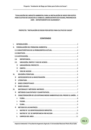 Este documento presenta una evaluación del impacto ambiental para la instalación de riego por goteo para el cultivo de cacao en el predio El Limón, ubicado en el distrito de Pucara, provincia de Jaén, departamento de Cajamarca. Se caracteriza el medio ambiente del predio e identifica los posibles impactos de las actividades del proyecto mediante el uso de matrices. El objetivo es determinar las afecciones ambientales y proponer medidas de mitigación para realizar el proyecto de manera sostenible.