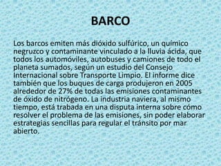 El documento describe los efectos de diferentes medios de transporte en el medio ambiente. Los barcos emiten más dióxido de azufre que todos los vehículos terrestres juntos y los buques de carga produjeron el 27% de las emisiones de óxido de nitrógeno en 2005. Los vuelos en avión generan grandes cantidades de emisiones de carbono y contribuyen al 15% de las emisiones mundiales, mientras que el metro de Madrid ha calculado su huella de carbono y los resultados son favorables.