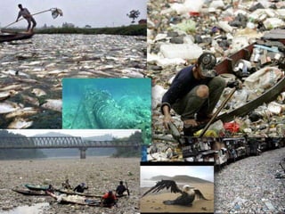 El documento describe los impactos ambientales como efectos de las acciones humanas en el medio ambiente. Estos incluyen el agotamiento de recursos naturales como el petróleo y la extinción de especies animales debido a factores como la contaminación y la pérdida de hábitat. También analiza los factores que contribuyen a la erosión del suelo como el agua y el viento, y las consecuencias como la pérdida de fertilidad. Finalmente, clasifica diferentes tipos de contaminación como biológica, química y física y
