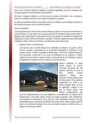 El documento habla sobre el impacto ambiental. Define el impacto ambiental como el efecto que produce una acción humana sobre el medio ambiente. Explica que puede ser positivo o negativo y clasifica los impactos en impactos sobre el medio natural, impactos ambientales a nivel mundial como la contaminación por petróleo, y los impactos ambientales de la guerra.