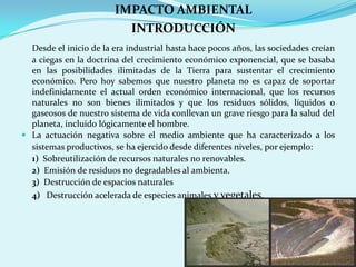 Este documento presenta una introducción al concepto de impacto ambiental. Explica que las sociedades anteriormente creían en el crecimiento económico ilimitado pero ahora saben que los recursos naturales no son ilimitados y que la contaminación puede dañar al planeta. También describe cuatro niveles en los que las actividades humanas han tenido un impacto negativo en el medio ambiente: sobreutilización de recursos, emisión de residuos, destrucción de espacios naturales y destrucción de especies.