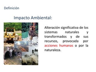 Este documento define el impacto ambiental como la alteración significativa de los sistemas naturales y transformados provocada por acciones humanas o naturales. Explica que los impactos ambientales pueden clasificarse según su tipo (aprovechamiento de recursos o contaminación), efecto, relación causa-efecto, persistencia, periodicidad, capacidad de recuperación, interrelación, intensidad, momento de manifestación, extensión y alcance espacial. Además, identifica algunos tipos de impactos como el aprovechamiento de recursos renovables y no renovables