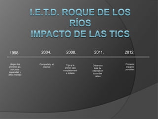 El documento describe la evolución de las tecnologías de la información y la comunicación (TIC) en el sistema educativo desde 1998 hasta 2012, destacando hitos como la llegada de las primeras computadoras personales en 1998, el acceso a Internet en 2004, la cobertura total de Internet en todas las escuelas en 2008, y los primeros equipos portátiles en 2011. También resalta cambios en la formación académica como mayores espacios de investigación y mejoras en el material de consulta que agilizaron las labores escolares y motivaron el aprendizaje.