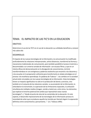 Las TIC han transformado profundamente las relaciones interpersonales y la comunicación, pero también han provocado un acceso descontrolado a información sin filtros. Si bien las TIC tienen un gran potencial para cambiar la educación, los docentes y escuelas no estaban preparados para aprovechar este potencial. Para que las TIC se conviertan en aliadas estratégicas de la enseñanza, se necesita forjar alianzas entre la escuela, familia y otros sectores para brindar una educación integral y de calidad para todos.