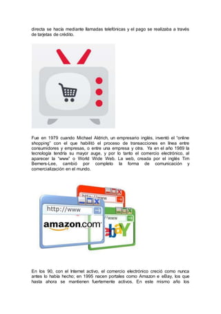 El comercio electrónico, que abarca desde la venta por catálogo en 1920 hasta la explosión de plataformas como Amazon y eBay en los 90, ha trasformado significativamente la forma de realizar transacciones comerciales. Este fenómeno ha introducido diversos tipos de comercio, incluyendo B2B, B2C y C2C, y ha impactado profundamente en el mercado laboral y en la estructura social, permitiendo a los individuos vender productos con mayor flexibilidad. Las características tecnológicas del comercio electrónico, como su ubicuidad y capacidad de personalización, han ampliado las oportunidades de negocio y han cambiado los hábitos de consumo en todo el mundo.