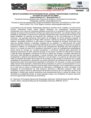 Este documento discute la falta de evidencia científica sobre el impacto económico de ectoparásitos como la garrapata común del ganado y la mosca de los cuernos en la ganadería colombiana. A pesar de que tradicionalmente se considera que estos ectoparásitos causan importantes pérdidas, los estudios existentes se realizaron principalmente en sistemas de producción diferentes a los del trópico. El análisis de estudios de caso locales mostró una amplia variabilidad en los parámetros que dificulta estim