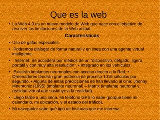 La Web 4.0 es un nuevo modelo de internet que tiene como objetivo resolver las limitaciones de la Web actual. Algunas características clave incluyen el uso de gafas inteligentes, la capacidad de dialogar con agentes virtuales inteligentes, y el acceso a internet a través de dispositivos portátiles de alta resolución e implantados en vehículos e incluso en el cerebro humano. La Web 4.0 también promete entender mejor los intereses y necesidades de los usuarios.