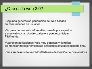 La Web 2.0 es una segunda generación de la Web basada en comunidades de usuarios, donde cualquiera puede participar fácilmente y compartir contenido. Se caracteriza por aplicaciones sencillas que ponen al usuario final en el centro, permitiendo la creación y administración flexible de contenidos a través de sistemas de gestión de contenidos.
