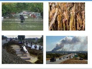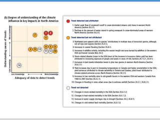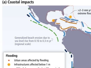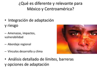 Este documento resume el Quinto Reporte del IPCC sobre el cambio climático en América del Norte y Centroamérica, con un enfoque en los impactos, la adaptación y la vulnerabilidad en México y Centroamérica. Resalta que la región ya está experimentando los impactos del cambio climático, lo que revela una gran vulnerabilidad. Si las emisiones continúan aumentando, los riesgos del cambio climático se intensificarán, con impactos severos y generalizados. Se requiere una mejor gestión de riesgos a través