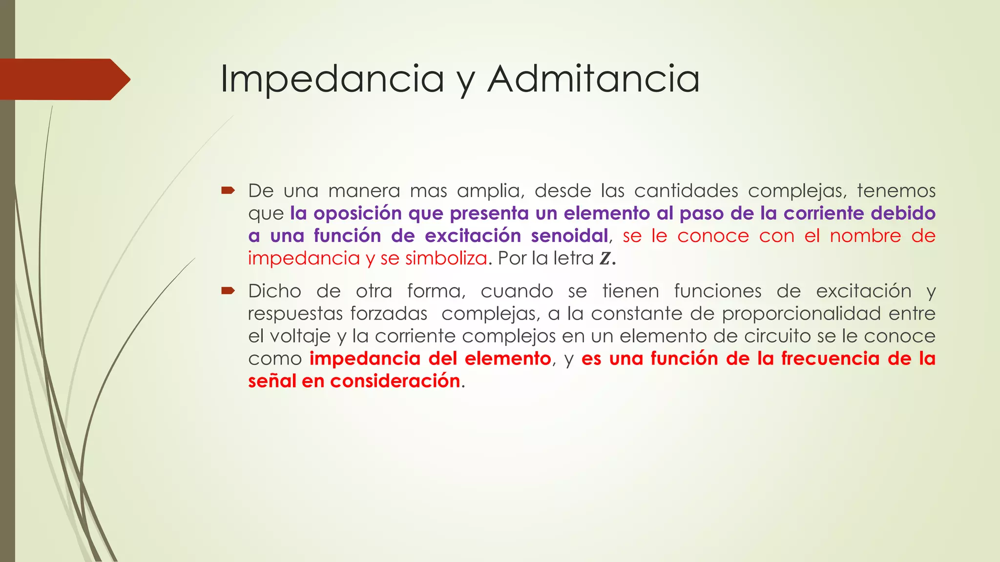 Este documento describe conceptos de impedancia y admitancia en circuitos de corriente alterna. Explica que la impedancia es la oposición que presenta un elemento al paso de la corriente debido a una función de excitación senoidal. Define la impedancia como una cantidad compleja que depende tanto de la resistencia como de la reactancia de un elemento. También analiza circuitos en serie y cómo calcular la impedancia total mediante la suma de las impedancias individuales.