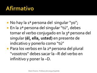 Este documento explica la formación del imperativo afirmativo y negativo en español. Indica que el imperativo afirmativo se usa para dar órdenes e instrucciones, y que en la segunda persona singular se toma el verbo en tercera persona singular. También muestra las conjugaciones de los verbos más comunes en los diferentes pronombres. Finalmente, señala que en el imperativo afirmativo los pronombres van unidos al verbo, mientras que en el negativo van antes del verbo.