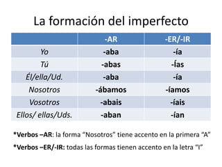 El documento describe el imperfecto en español. Explica que se usa para acciones en el pasado, descripciones, sentimientos y emociones en el pasado. Luego detalla la conjugación del imperfecto para verbos -ar, -er/-ir y verbos irregulares como ser, ir y ver. Finalmente, proporciona ejemplos del uso del imperfecto para acciones simultáneas, estados físicos y mentales en el pasado.