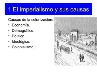 El documento resume el imperialismo europeo y sus consecuencias. Detalla las causas económicas, demográficas, políticas e ideológicas de la colonización, así como la organización y explotación de las colonias. Explica cómo se repartió África y otros proyectos geopolíticos de Gran Bretaña y Francia. Finalmente, señala que el colonialismo y nacionalismo contribuyeron a las rivalidades entre potencias que llevaron a la Primera Guerra Mundial.