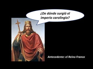 El Imperio Carolingio surgió en el siglo VIII a partir del Reino Franco, cuando Pipino el Breve derrocó al último rey merovingio con apoyo papal y estableció la dinastía Carolingia. Bajo el liderazgo de Carlomagno, el imperio alcanzó su máxima expansión, abarcando gran parte de Europa occidental y teniendo como objetivo político reconstruir el antiguo Imperio Romano en alianza con la Iglesia católica. Sin embargo, tras la muerte de Carlomagno en 814, el imperio