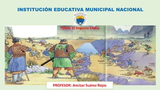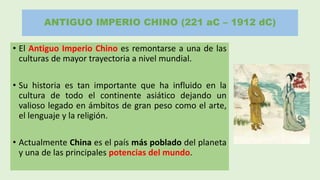 El documento resume la historia del Antiguo Imperio Chino desde su unificación en el 221 a.C. hasta su caída en 1912 d.C. Abarcó cuatro mil años de gobierno imperial con más de 11 dinastías. Tuvo tres etapas principales: Imperio Temprano, Imperio Medio e Imperio Tardío. China desarrolló una rica cultura y realizó importantes inventos como la brújula, el papel y la imprenta.