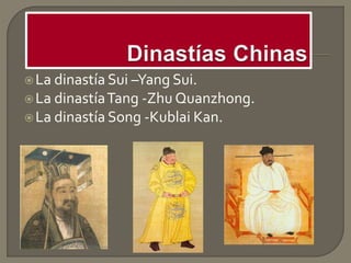 La dinastía Sui reunificó China en 589 y estableció el sistema de examen imperial. La próspera dinastía Tang gobernó durante tres siglos hasta 907, seguida por las Cinco Dinastías y los Diez Reinos. La dinastía Song reunificó la mayor parte de China en 960 y vio grandes avances, pero el imperio mongol conquistó China en 1279.